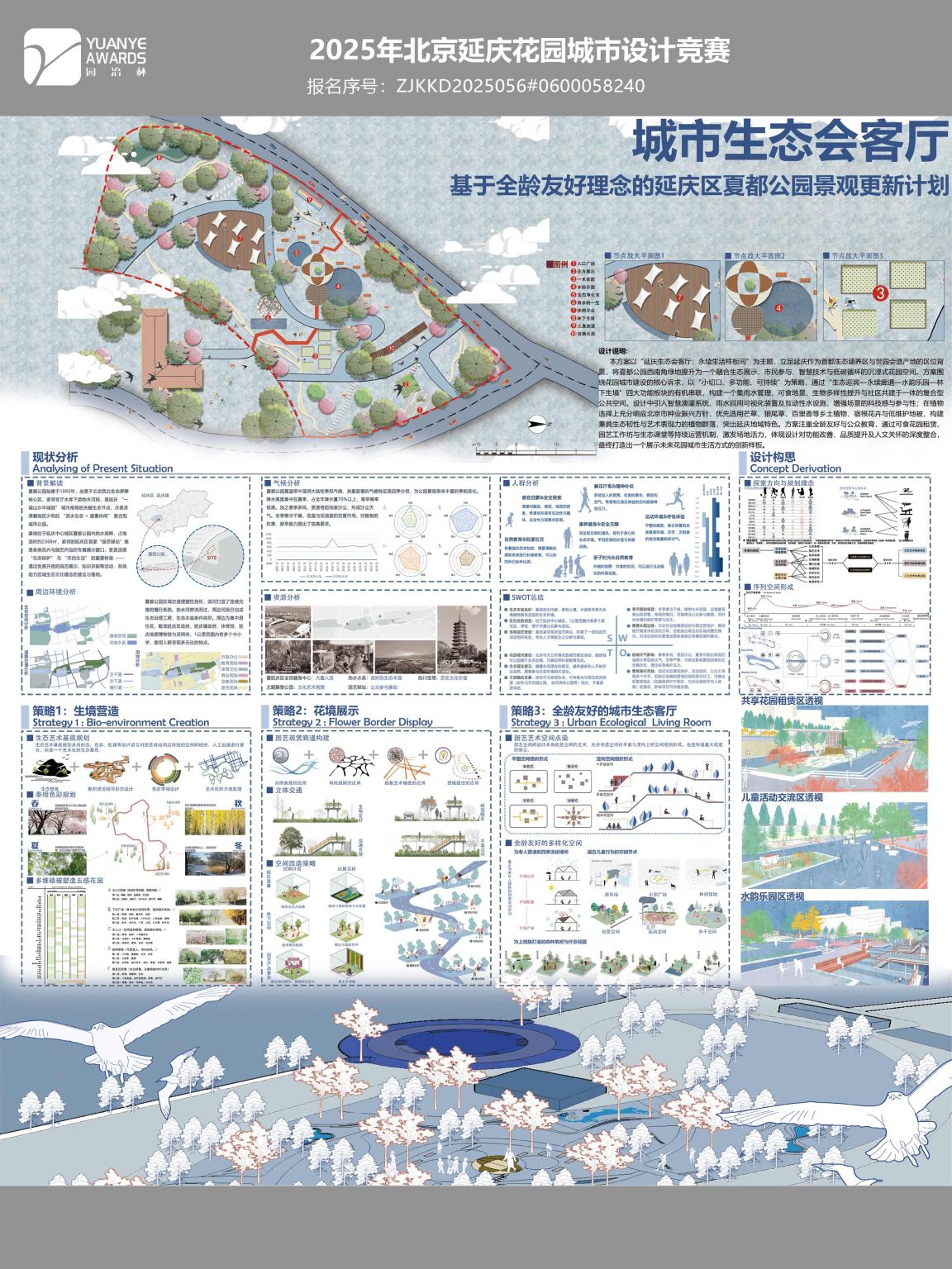 本方案以“延庆生态会客厅:永续生活样板间”为主题,立足延庆作为首都生态涵养区与世园会遗产地的区位背景,将夏都公园西南角绿地提升为一个融合生态展示、市民参与、智慧技术与低碳循环的沉浸式花园空间。方案围绕 ...